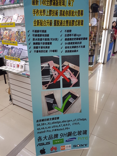店家門口立著斗大的《4K全膠滿版玻璃》,店員說最近前來貼玻璃的客人非常多,建議大家先採預約製,以便包膜師安排時間以免久候。