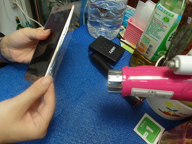 將手機交付給包膜師後,將舊的保護貼撕去後,接著很細心的擦拭整個手機鏡面,再貼上一層保護貼,以避免光學膠與手機直接接觸。