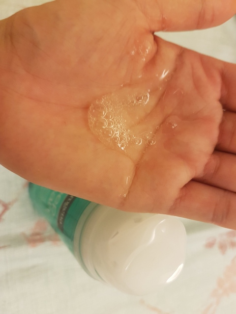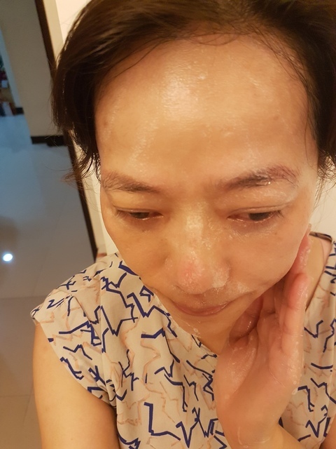 卸妝洗臉時,按壓2-3下的量擠在手中,潔顏油的質地相當特別,是透明略帶濃稠的凝膠狀質地,並非是傳統的油油膩膩的質地。