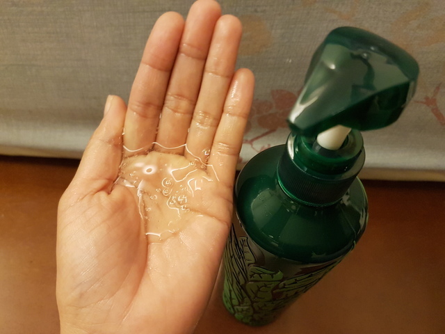 取出適量的舒活洗髮精於手心上,具有芬芳香味的洗髮精,是略帶濃稠的透明狀質地。
