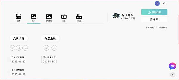 在頁面上的合作項目:可以針對直播、圖文、限時動態、影音、短影音,能快速查看所有合作專案