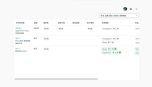 一張表快速瀏覽網紅何時交稿的時間,以及所有過稿的過程掌握